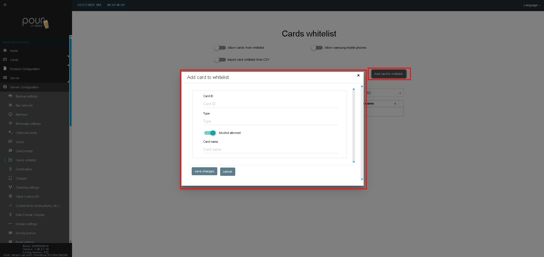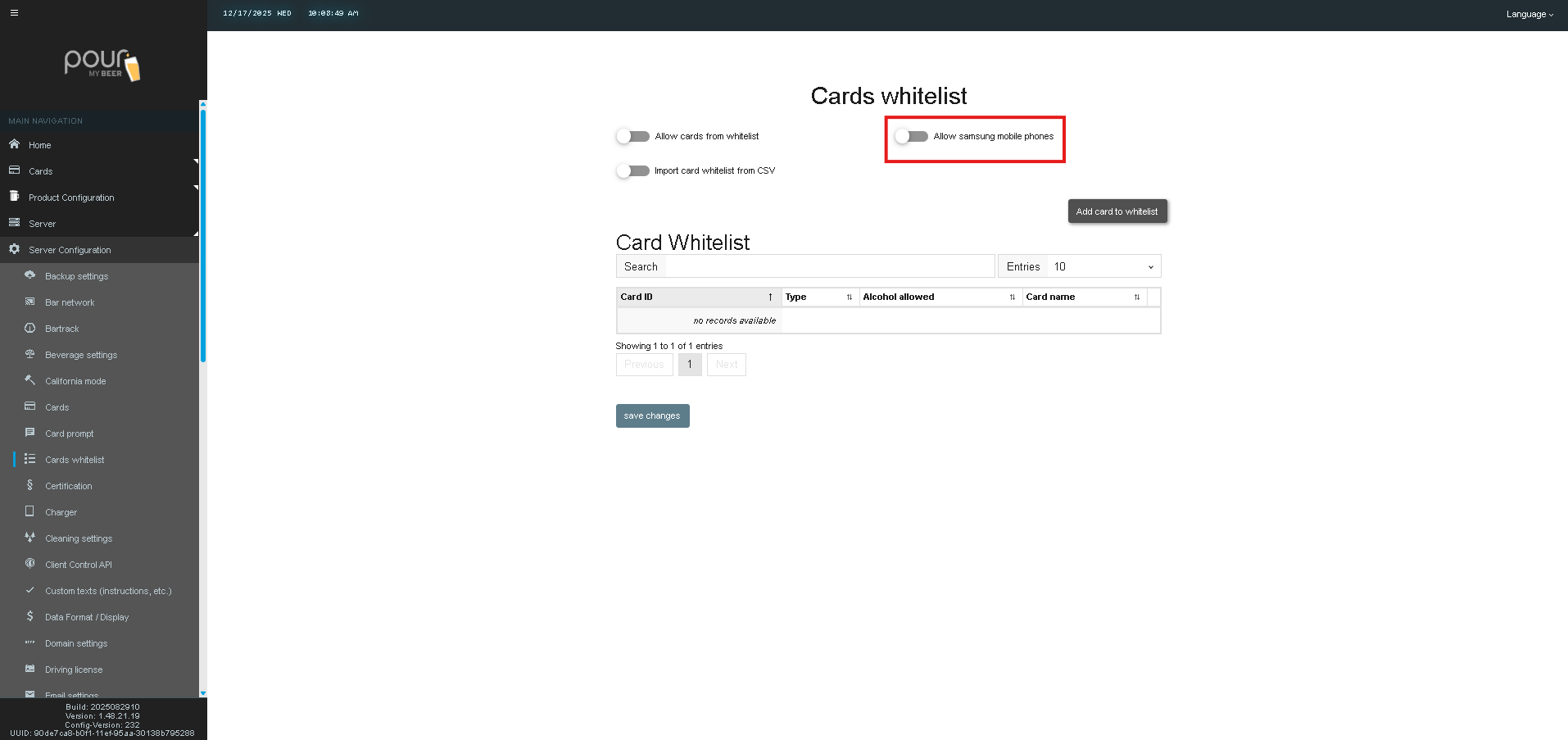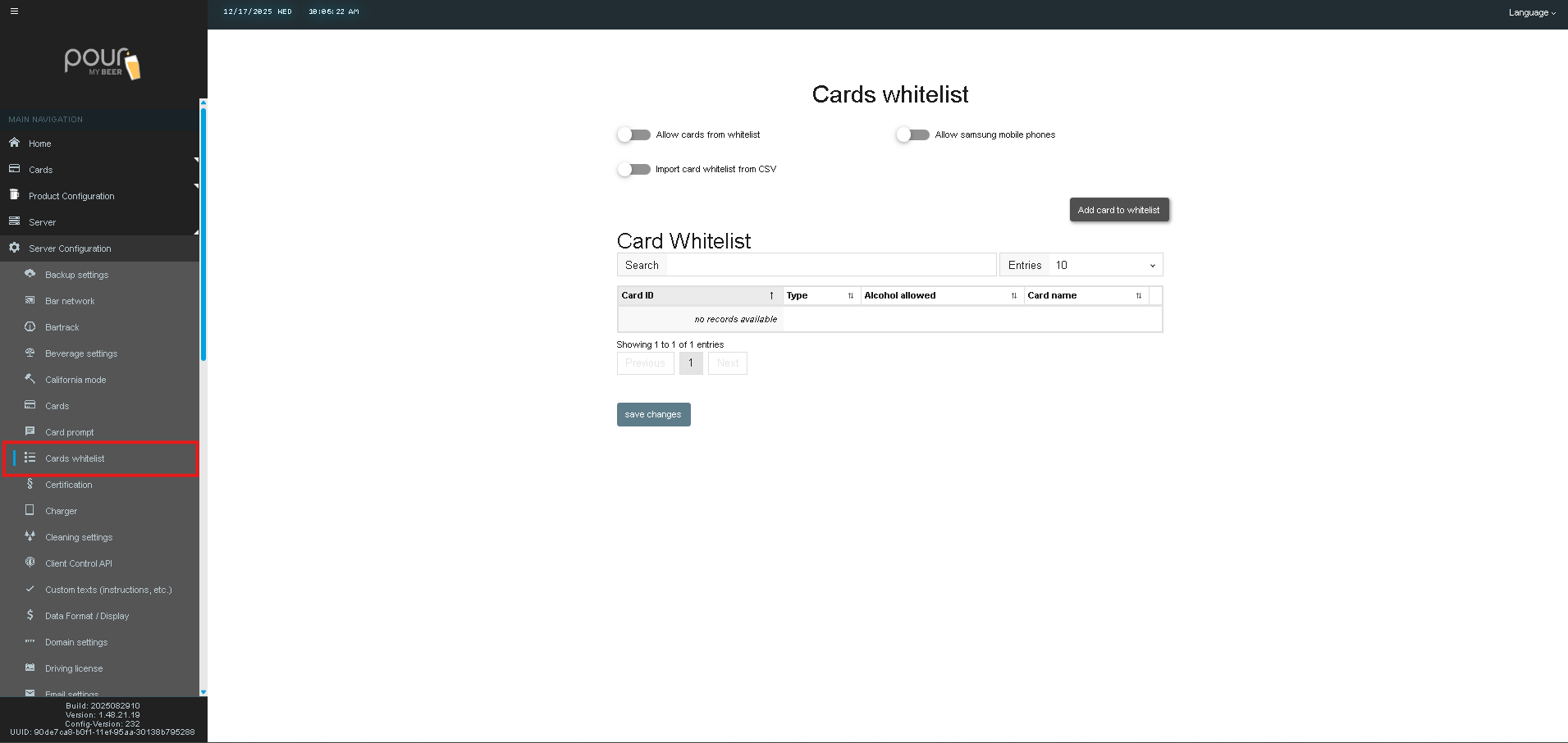 The Cards Whitelist feature allows you to restrict usage of your Table Tap Go (TTG) system so that only approved cards or devices are permitted to dispense beverages.