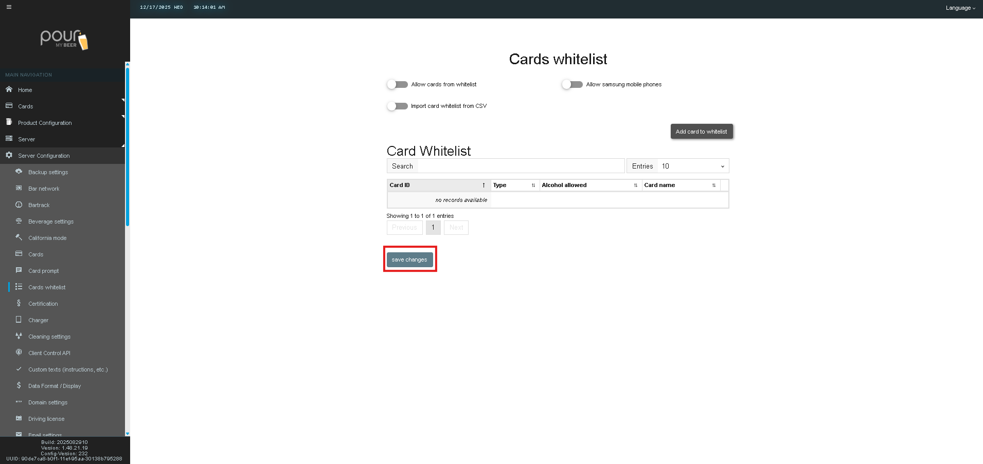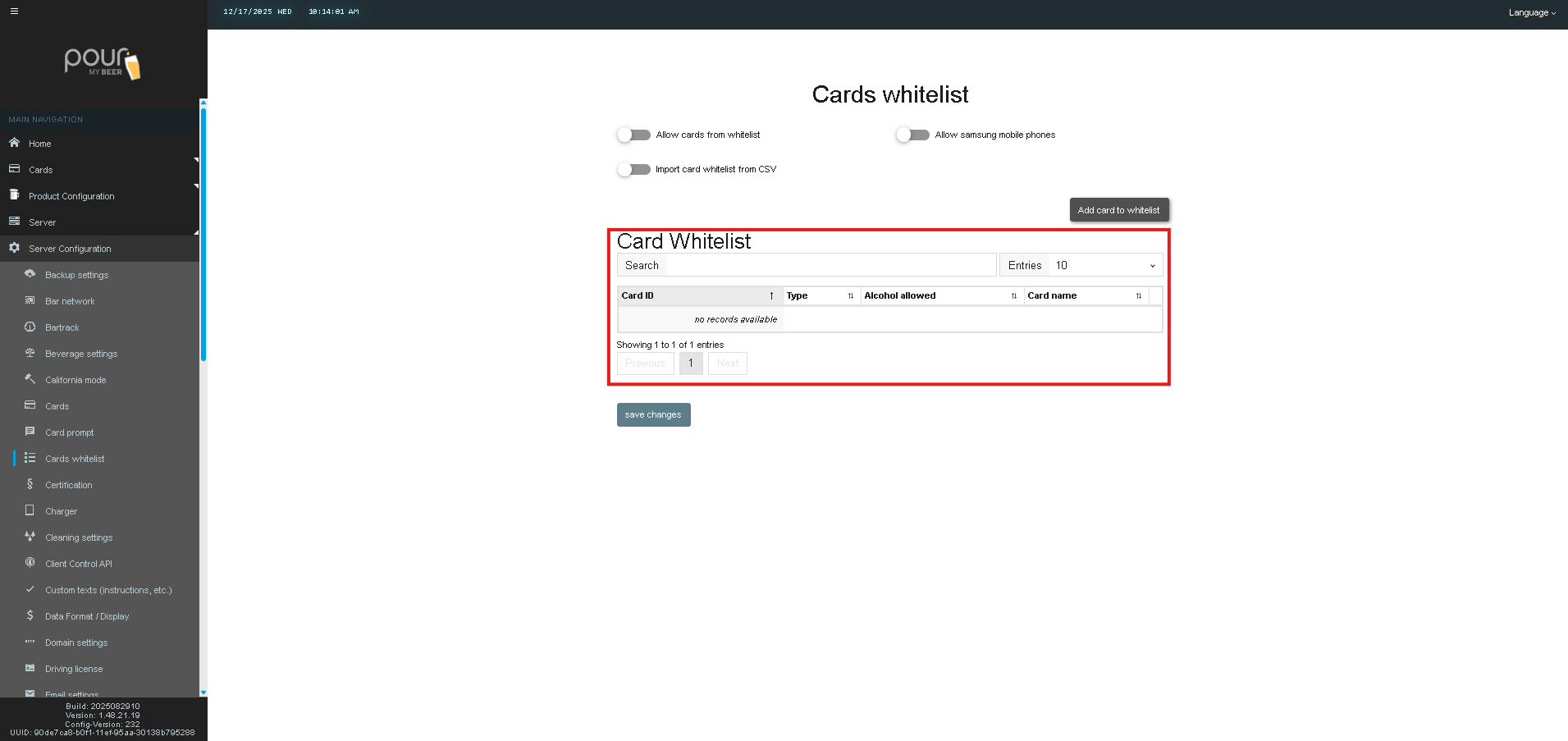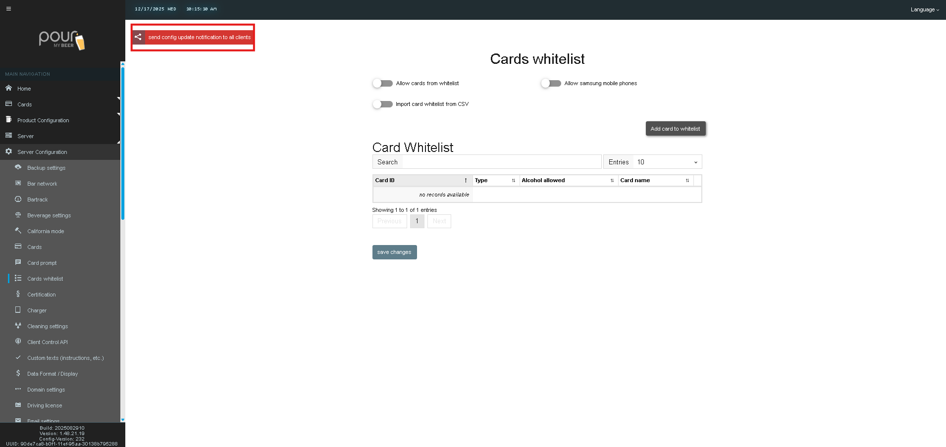 Enabling whitelist mode without adding cards will block all customers from pouring.
