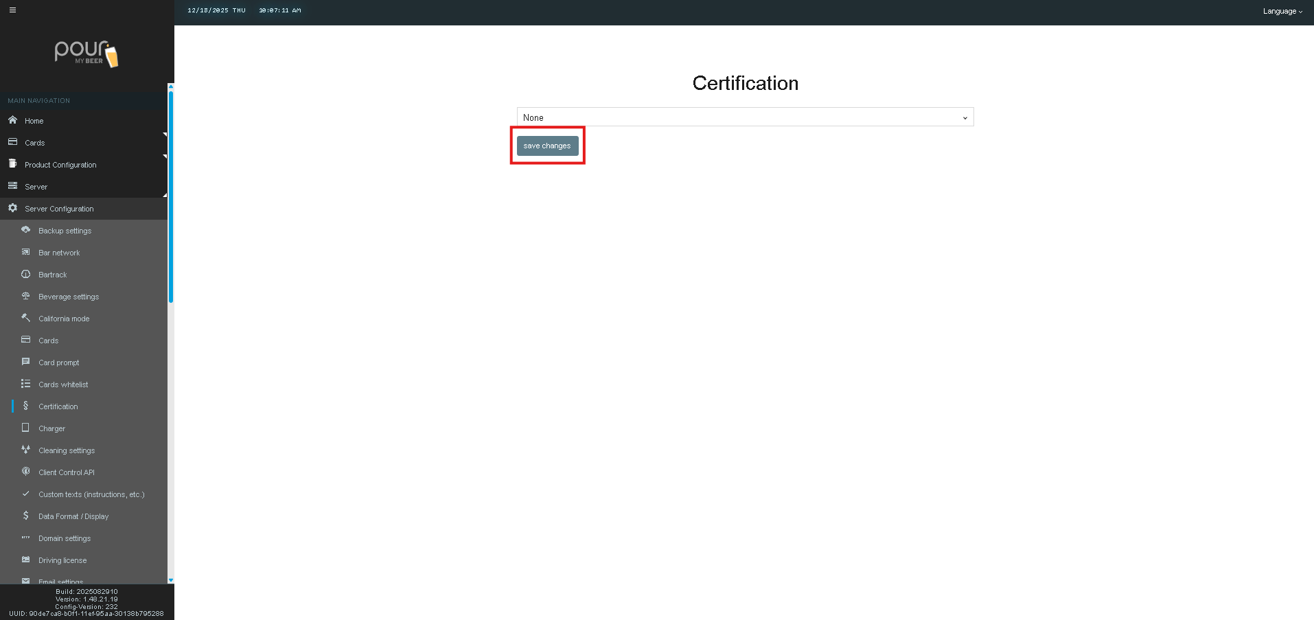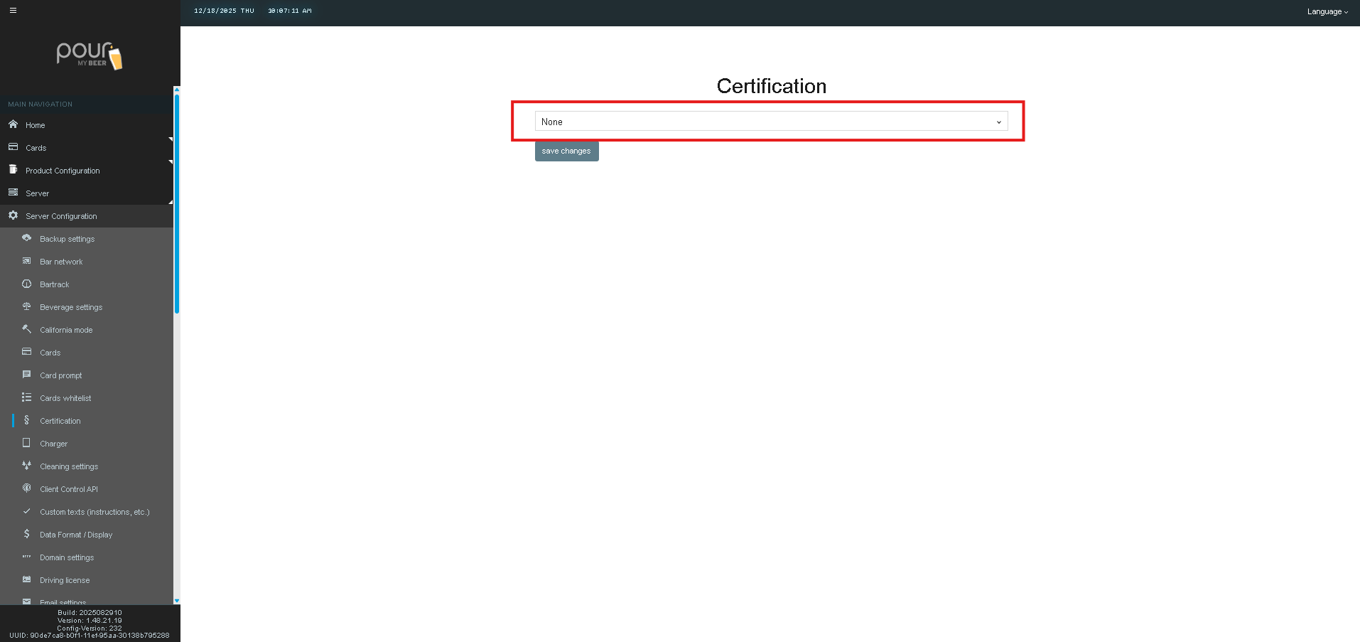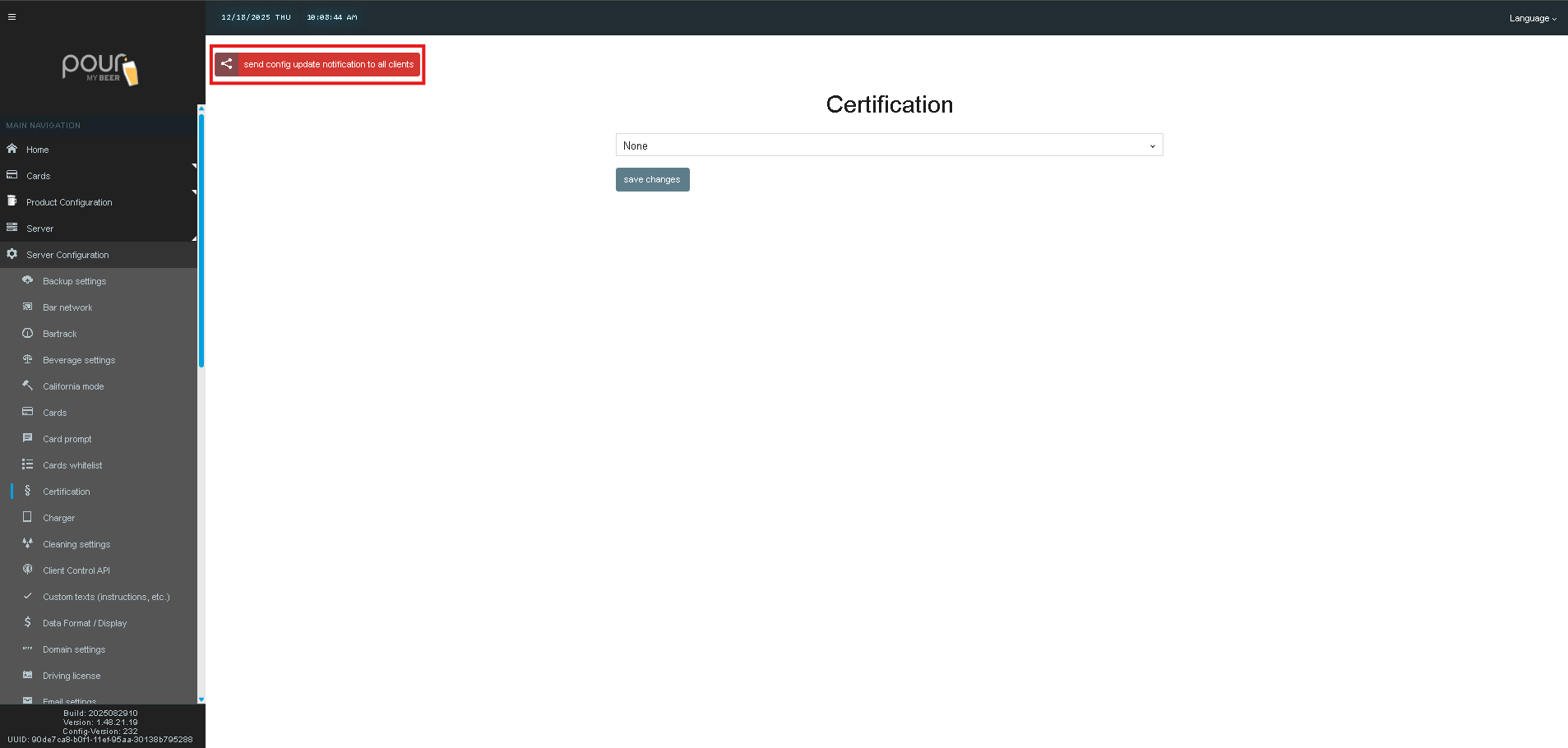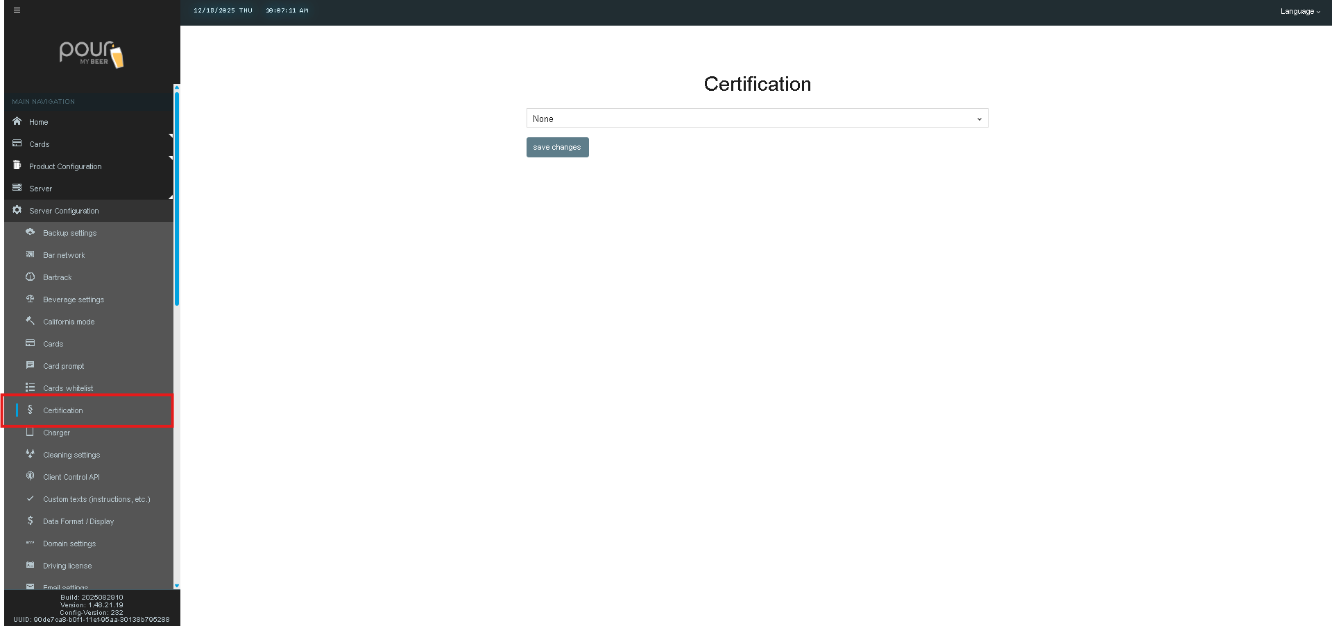 Certification options are typically configured or enabled by PourMyBeer support and may vary by installation.