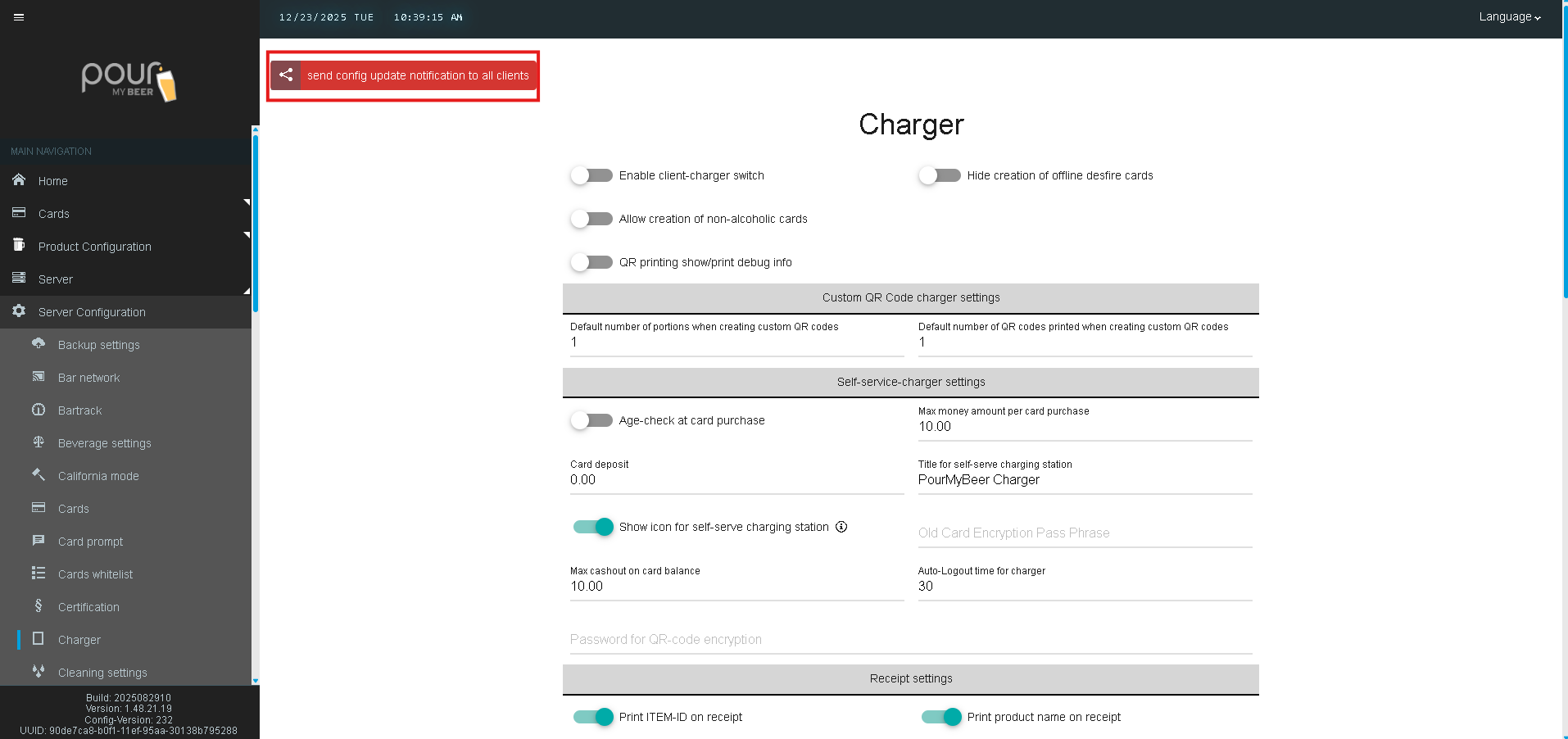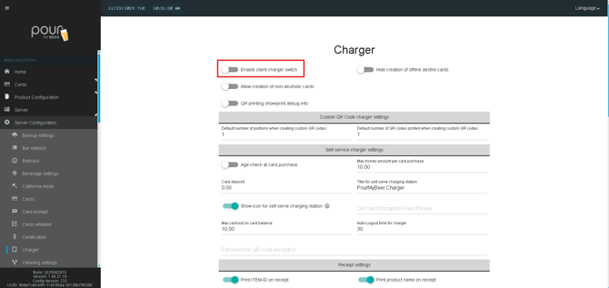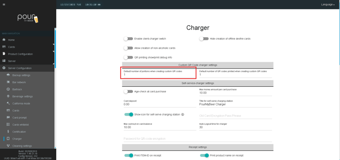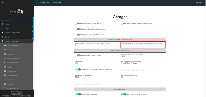 The Charger settings in Table Tap Go control how customer cards and QR codes are created, managed, and printed at charging stations. These options are typically used at host stands, kiosks, or self-service charging locations.