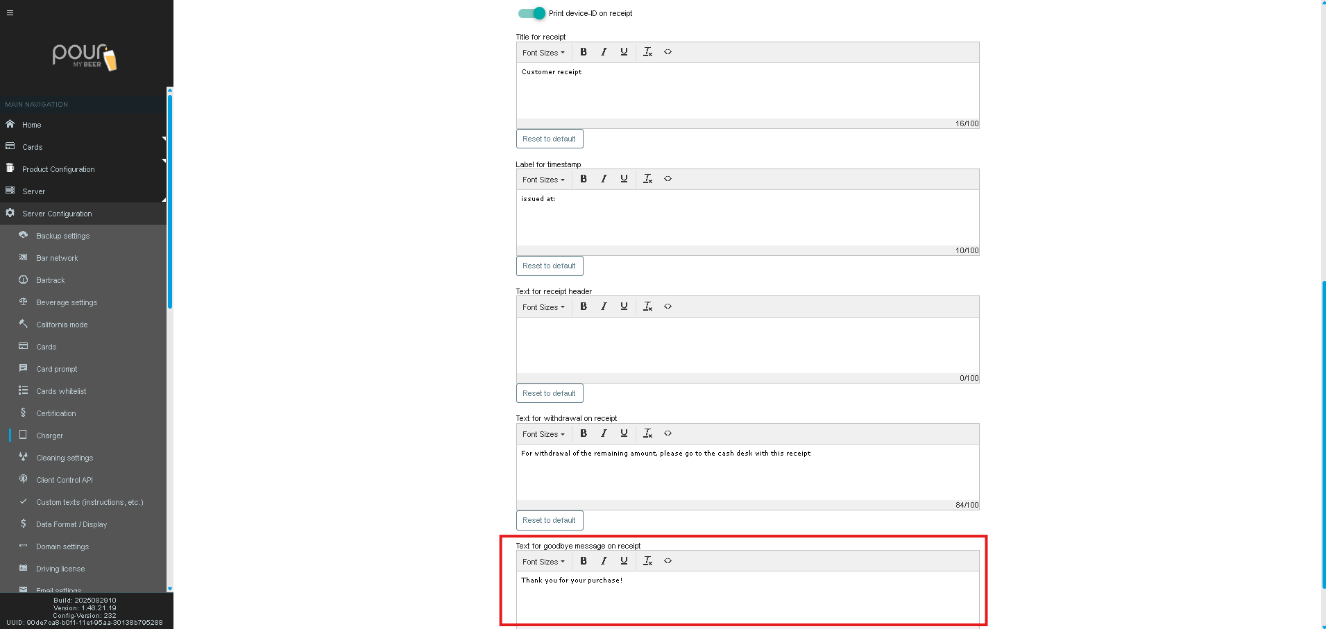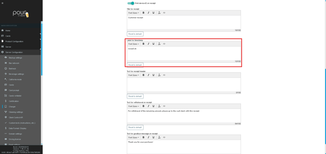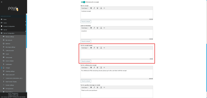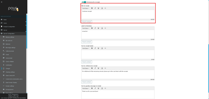 You can customize the text shown on different parts of the receipt using the built-in text editor.