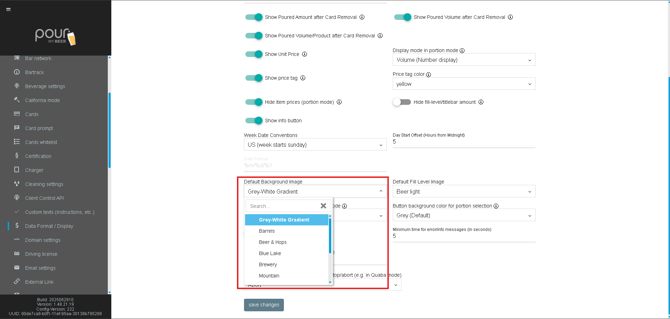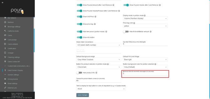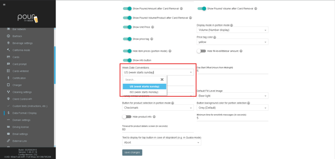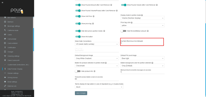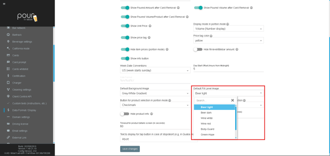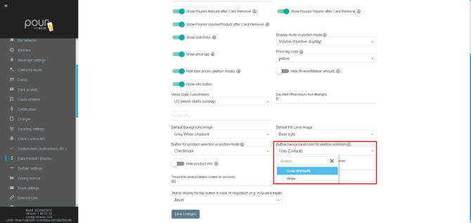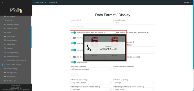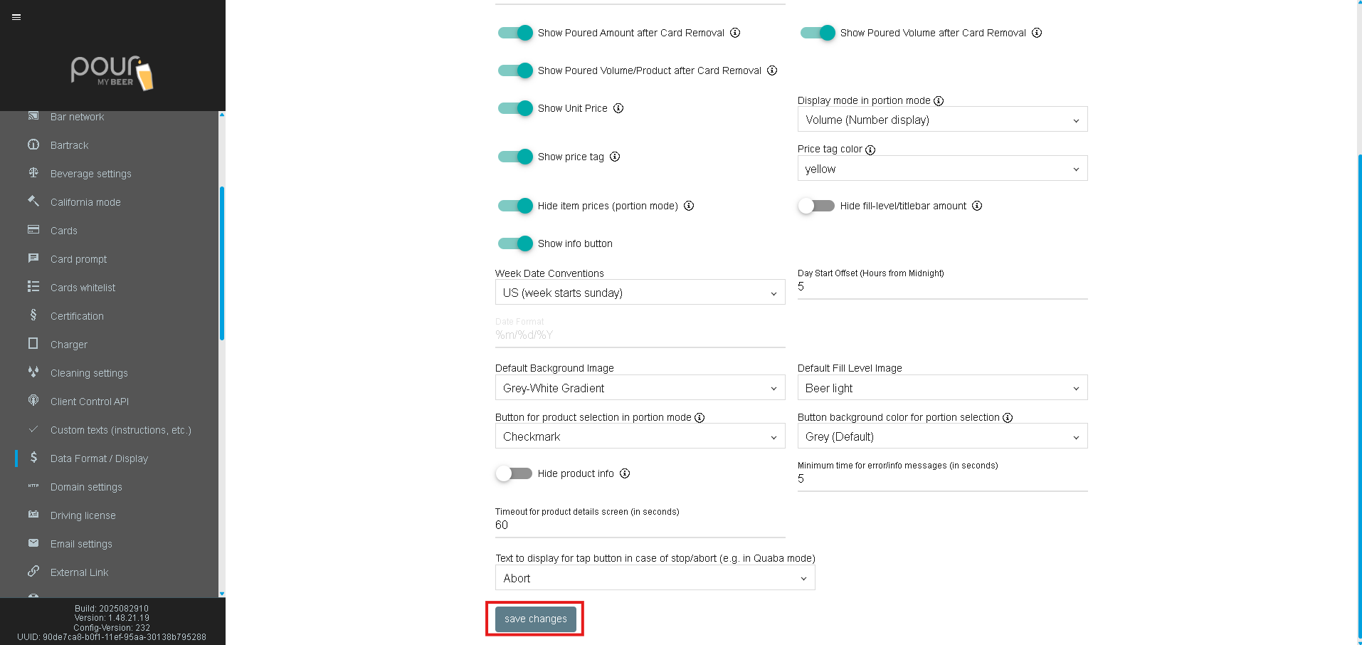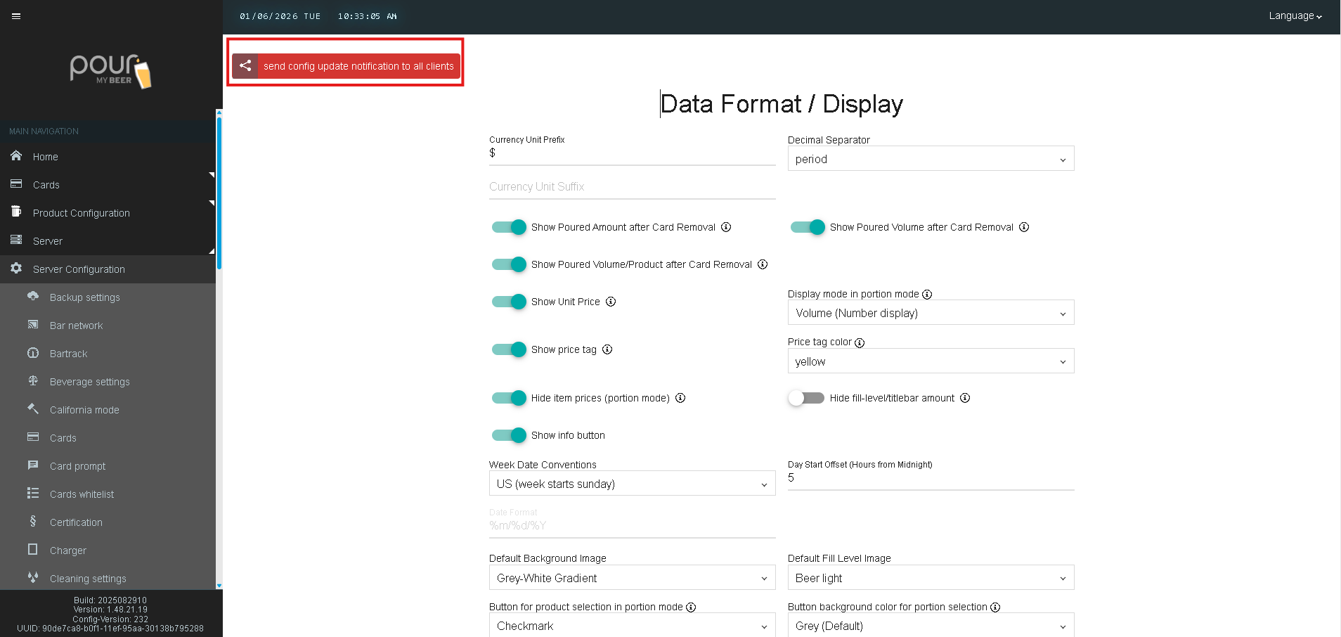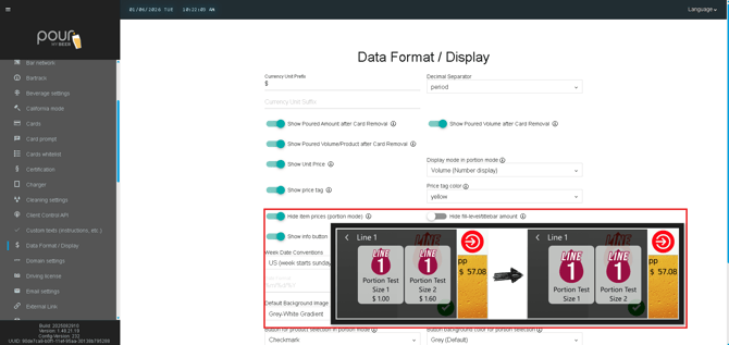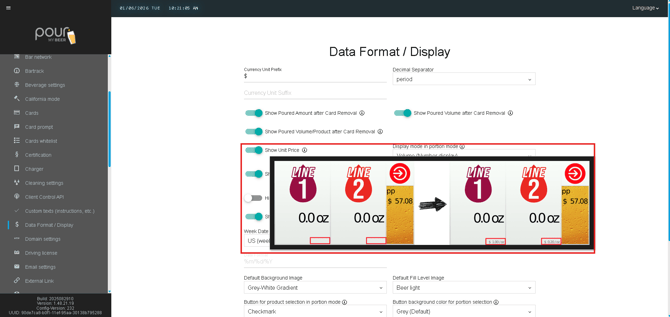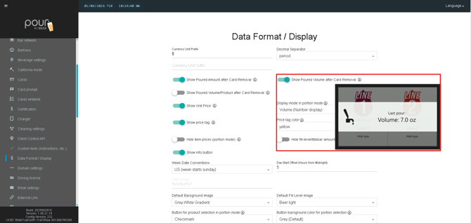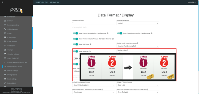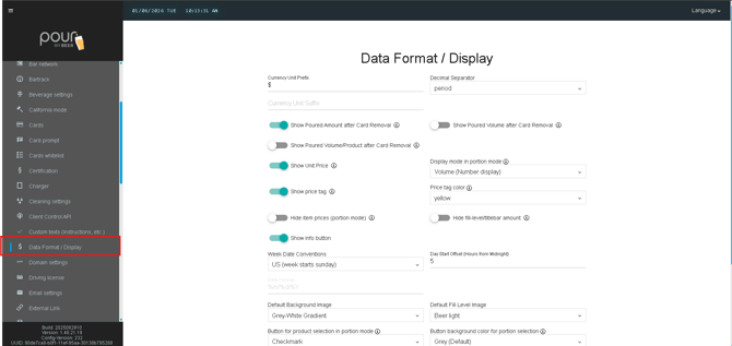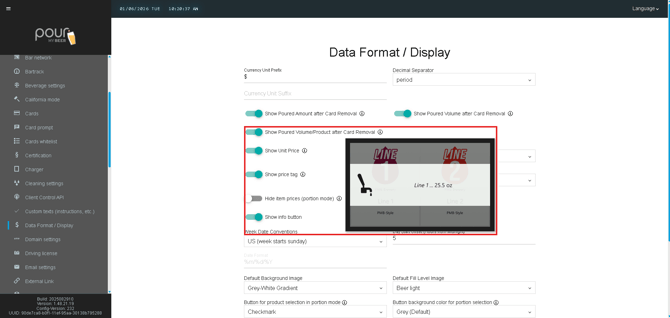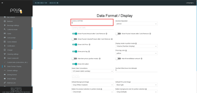 The Data Format / Display settings allow you to control how information is presented to customers on Table Tap Go tap screens. These options affect currency formatting, volume display, pricing visibility, date conventions, colors, buttons, and on-screen behavior.