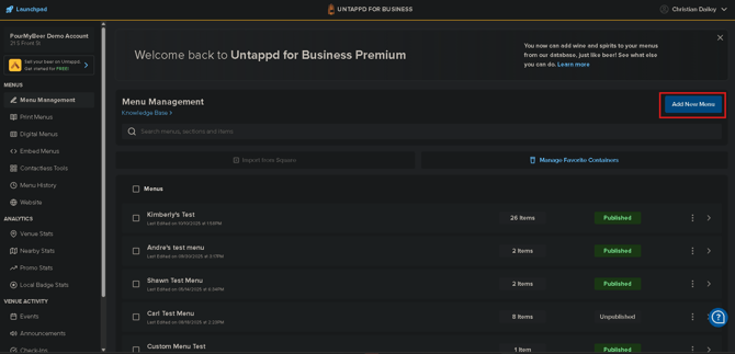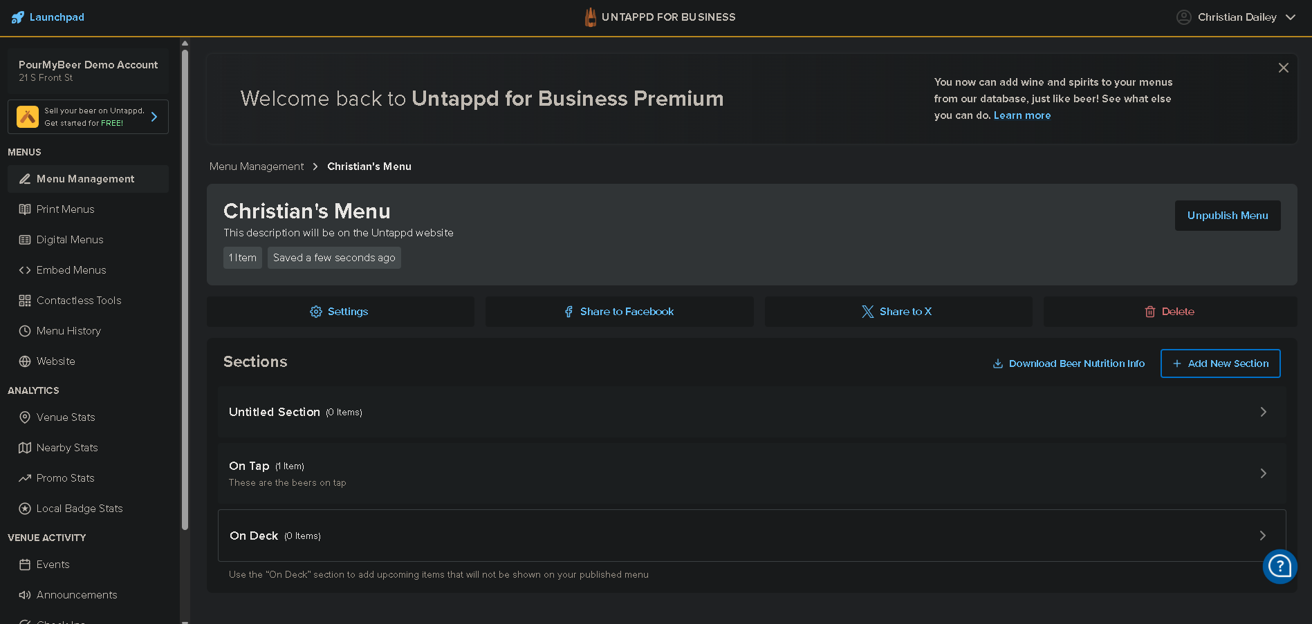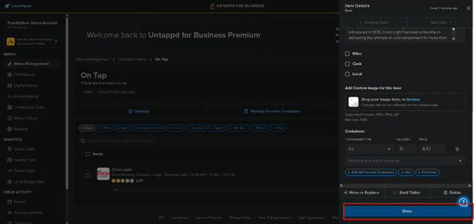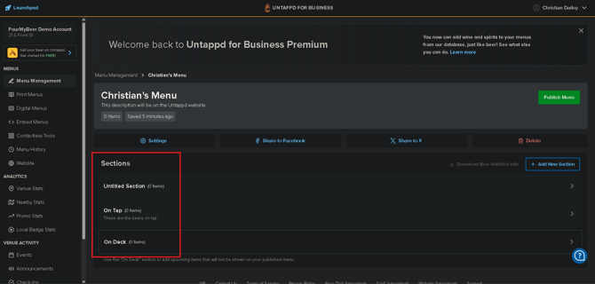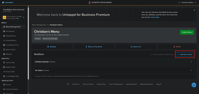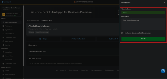 - Enter in the Menu name, Description, and if you want the prices on untappd and select create.