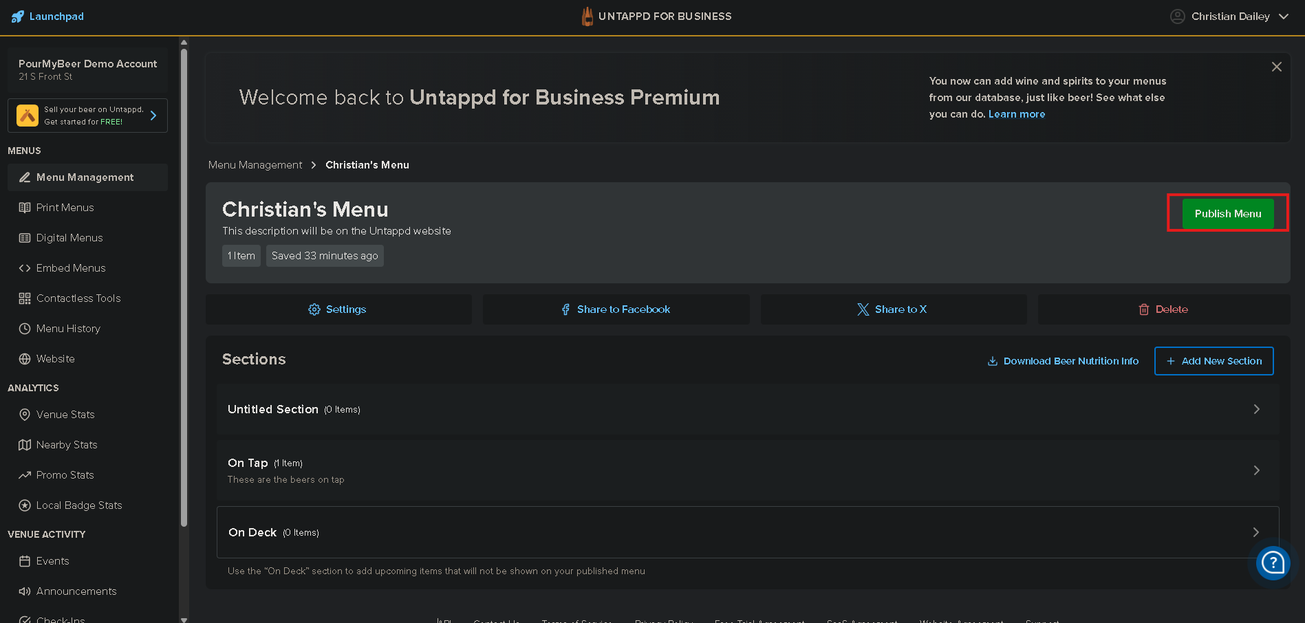 Once the Beers have been added and container and prices set we need to publish the menu to allow PourMyBeer to Sync from it.